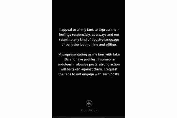 “I appeal to all my fans to express their feelings responsibly, as always and not resort to any kind of abusive language or behavior both online and offline. Misrepresenting as my fans with fake IDs and fake profiles, if someone indulges in abusive posts, strong action will be taken against them. I request the fans to not engage with such posts” posted Allu Arjun on his social media page.