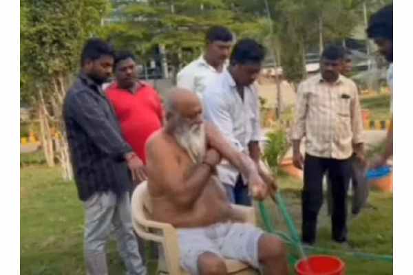 Prabhakar Reddy, a leader of opposition Telugu Desam Party (TDP), sat on a chair and took a bath in front of the municipal office.