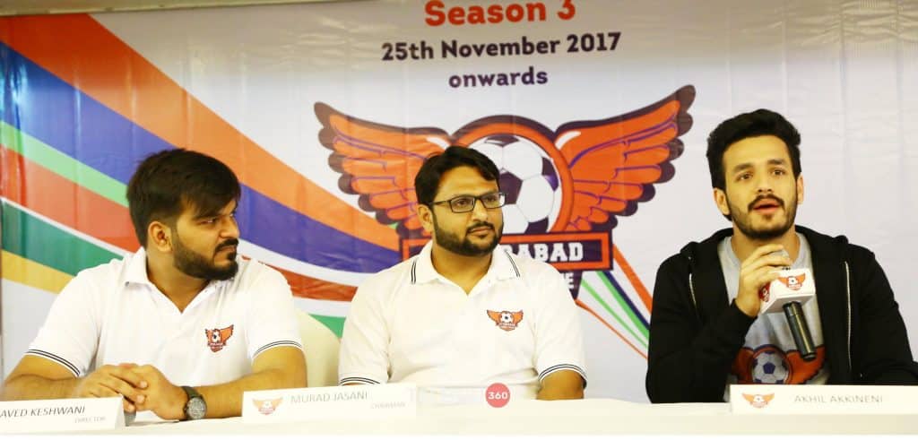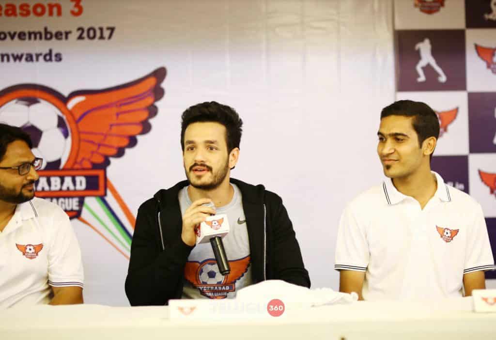 - Akhil Akkineni addressing a press conference organised to announce him as the Brand Ambassador of the 3rd Season of Hyderabad Football League on Wednesday, also seen (L-R) are Naved Keswani, Director, HFL & Murad Jasani, Chairman, HFL