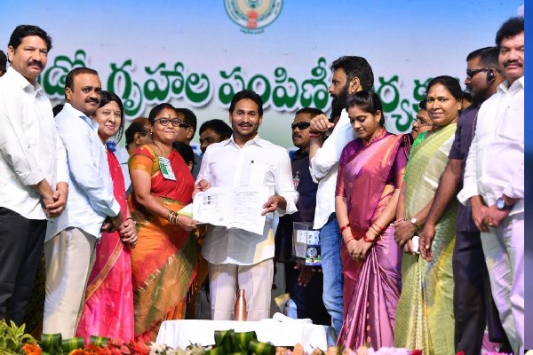 Chief Minister Y S Jagan Mohan Reddy formally handed over to the beneficiaries Rs. 800crore worth 8912 TIDCO houses built in a single layout of 77 acres in Gudivada municipal limits.