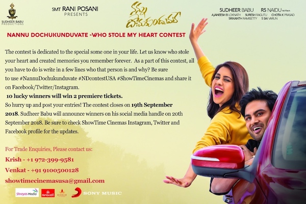 ShowTime Cinemas is happy to announce the grand premieres of its latest Rom-Com “Nannu Dochukunduvate” staring Sudheer Babu and Nabtha Natesh on 20th September 2018.