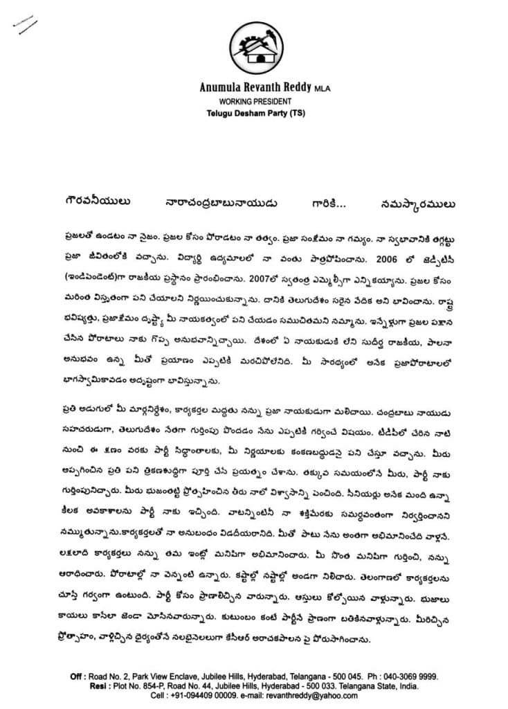 Revanth’s resignation letter! Leaving TDP is no less than heart break