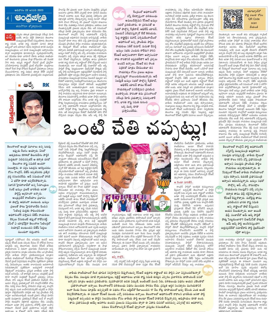 ఆంధ్రజ్యోతి ఎండీ వేమూరి రాధాకృష్ణ .. ఈ వారం కొత్తపలుకు ద్వారా కేసీఆర్ జాతీయ రాజకీయ భవిష్యత్ను.. రాష్ట్రంలో కేసీఆర్ రాజకీయ భవిష్యత్ను తేల్చేశారు. ఇప్పటికే ఆయన పనైపోయిందని.. దింపుడుకళ్లెం ఆశలతోనే పార్టీ పేరు మార్చుకుని.. రకరకాల విన్యాసాలు చేస్తున్నారని ఆయన అంటున్నారు. టీఆర్ఎస్ పార్టీ పెట్టినప్పటి నుండి కేసీఆర్కు అండగా ఉన్న ఉత్తర తెలంగాణలో ఇప్పుడు కేసీఆర్పై తీవ్ర వ్యతిరేకత ఉందని… అరవై శాతం మంది ప్రజలు వ్యతిరేకంగా ఉన్నారని ముందుగా ఇల్లు చక్కదిద్దుకోవాలని కూడా ఆర్కే సలహా ఇచ్చారు.