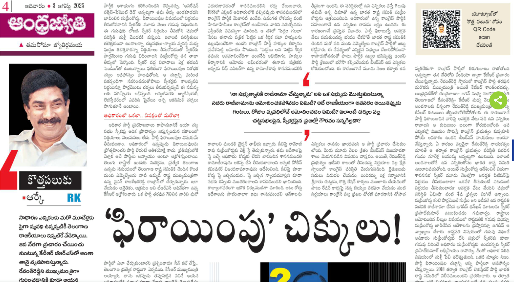 ఆర్కే విశ్లేషణ ప్రధానంగా పార్టీ ఫిరాయింపుల చట్టంలో ఉన్న లోపాలపై నడిచినా… రేవంత్ సర్కార్ కు తీపి కబురు చెప్పారు రేవంత్. ఏడాదికే కాంగ్రెస్ ప్రభుత్వంపై విపరీతంగా వ్యతిరేకత వచ్చిందని బీఆర్ఎస్ ప్రచారం చేస్తోంది. ఇప్పుడు ఆ వ్యతిరేకత కాస్తా అనుకూలతగా మారుతోందన్న అభిప్రాయం ప్రారంభమయ్యేలా ఆర్కే ఆర్టికల్ ఉంది. ఇది రేవంత్ కు సానుకూల సందేశమే పంపుతోంది.