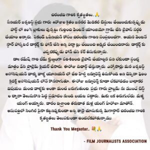 హైదరాబాద్ స్టార్ హాస్పిటల్స్ వైద్యులకు ఫోన్ చేసి ప్రభు వైద్యానికి అన్ని ఏర్పాట్లు చేయాలన్నారు. బైపాస్ సర్జరీ చేయకుండా స్టంట్స్ వేసి ప్రాబ్లమ్ క్లియర్ చేసారు. ఆసుపత్రిలో ప్రభు ఒక్క రూపాయి కూడా చెల్లించకుండా అన్ని తానై చూసుకున్నారు చిరంజీవి. ప్రభు తాజాగా కోలుకోవడంతో సోమవారం ఆసుపత్రి నుంచి డిశ్చార్జ్ అయ్యారు. ఈ సందర్భంగా తాను చిరంజీవికి రుణపడి ఉంటానని ప్రభు కృతజ్ఞతలు చెప్పగా…చిరు సాయానికి జర్నలిస్టు సంఘాలు కూడా థ్యాంక్స్ చెప్పాయి.