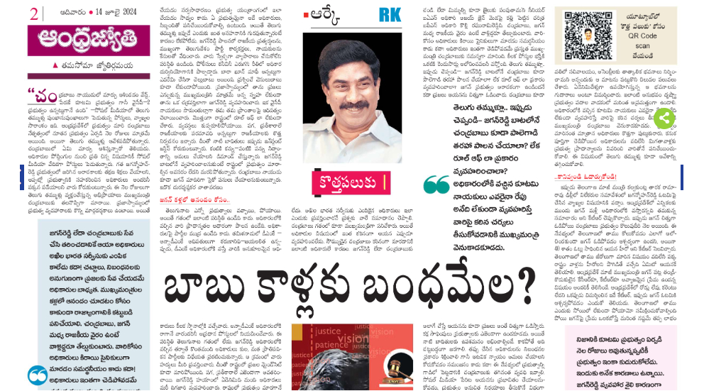ఆంధ్రజ్యోతి ఎండీ ఆర్కే వారం వారం వెలువరించే కొత్త పలుకులో టీడీపీ అధికారంలోకి వచ్చిన తర్వాత భిన్న స్వరం కనిపిస్తోంది. ఆయన పత్రికలో రోజువారీగా ఒకటి చేస్తారు… తర్వాత అది తప్పేం కాదని ఆయన ఆర్టికల్ రాస్తారు. పనిలో పనిగా .. టీడీపీ కూటమి ఎమ్మెల్యేలు ఏదో చేసేస్తున్నారని పుకార్లను ప్రజల్లోకి పంపుతున్నారు. మళ్లీ అందులోనే రివర్స్ లో అలాగే చేయాలని వేరే సందర్భంలో సలహాలిస్తున్నారు. ఈ వారం కొత్త పలుకు ఆర్టికల్ లో చంద్రబాబును ఎలా బద్నాం చేయాలో సాక్షి పత్రిక కూడా ఆర్కే నుంచి చాలా నేర్చుకోవాల్సి ఉంటుంది.