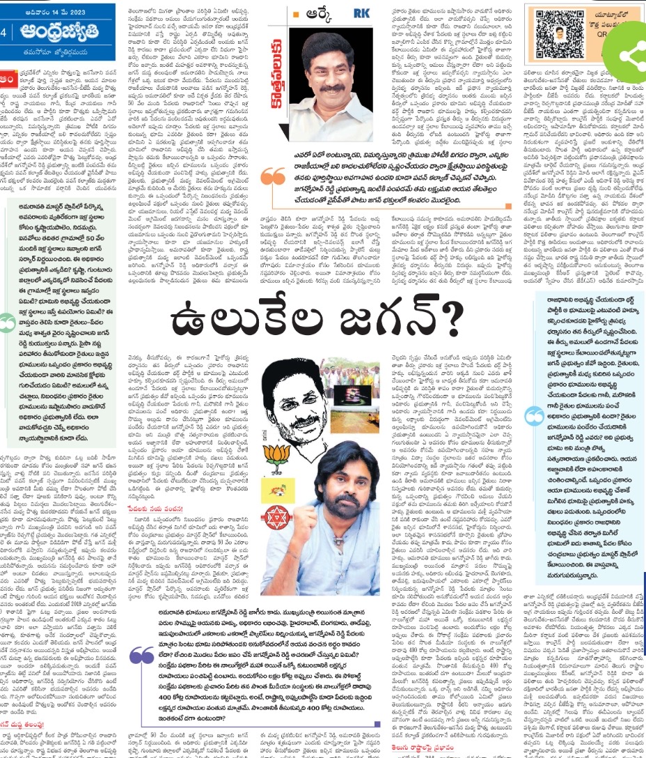 ఆంధ్రజ్యోతి ఎండీ ఆర్కే ఈ సారి న్యాయవ్యవస్థపై కనిపించని అసహనం వ్యక్తం చేశారు. రాజధాని కోసం రైతులు ఇచ్చిన భూములను పేదలకు సెంటు స్థలాలుగా పంపిణీ చేయవచ్చంటూ హైకోర్టు ప్రధాన న్యాయమూర్తి నేతృత్వంలోని ద్విసభ్య ధర్మాసనం ఇచ్చిన తీర్పును తప్పు పట్టారు. అంతకు ముందు హైకోర్టు ప్రధాన న్యాయమూర్తి ధర్మాసనం ఇచ్చిన తీర్పును గుర్తు చేసిన ఆయన రెండు పరస్పర విరుద్ధ తీర్పులు ఎలా ఇస్తారని ప్రశ్నించారు. రైతులు ఇచ్చిన భూములపై ధర్డ్ పార్టీలకు హక్కులు కల్పించడం సాధ్యం కాదని గతంలో తీర్పులు ఇచ్చారు. ఇప్పుడు సెంట్ బూమి పేరుతో పంచుతున్నారు. ఇది ధర్డ్ పార్టీకి కేటాయించడేమ. తీర్పును ఉ్లలంఘిస్తున్నారని స్పష్టంగా కనిపిస్తున్నా.. అనుకూలంగా తీర్పు ఇవ్వడమేమిటనేది ఆర్కే ప్రశ్న.