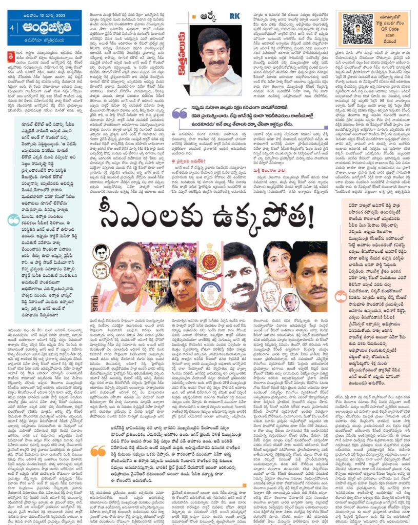 తన కొత్త పలుకులో ఈ వారం కేసీఆర్ అంశంపైనా విశ్లేషించారు. కేసీఆర్ బీజేపీపై ప్రకటించిన అసహజ యుద్ధం వల్లనే కవిత అరెస్టయ్యే పరిస్థితులు ఏర్పడ్డాయని దీనంతటికి కారణం ఆయనేనని తేల్చారు. ఢిల్లీ లిక్కర్ స్కాంలో కవితను పక్కాగా ఇరికించేశారని తేల్చారు. మొత్తం.. జగన్ విషయంలో ఆర్కే ఆలోచనలు.. ఎక్స్ ట్రీమ్ గా వెళ్తున్నాయని లాజిక్ లకు కూడా అందడంలేదని స్పష్టమవుతోంది.