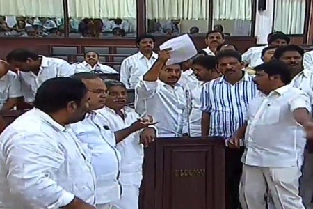 వైకాపా ఎమ్మెల్యే రోజాని శాసనసభ సమావేశాలలో పాల్గొనేందుకు అనుమతించనందుకు నిరసనగా ఆ పార్టీ సభ్యులు అందరూ శాసనసభకు వెళ్ళకుండా బయట ధర్నా చేస్తున్నారు. వారు రానప్పటికీ శాసనసభ సమావేశాలు యదాతధంగా కొనసాగుతున్నాయి. ప్రశ్నోత్తరాల సమయం ముగిసిన తరువాత సభలో బడ్జెట్ పై చర్చ మొదలుపెట్టారు. రోజా సస్పెన్షన్ పై హైకోర్టు ఇచ్చిన తీర్పు కాపీలను సభలో సభ్యులు అందరికీ పంచబడ్డాయి. దీని గురించి సభలో శాసనసభ వ్యవహారాల శాఖా మంత్రి యనమల రామకృష్ణుడు మాట్లాడుతూ ప్రతిపక్ష సభ్యులు సభకు రాకపోవడం చాలా బాధ కలిగిస్తోంది. రోజాతో సహా ఎవరిపైనా మా ప్రభుత్వానికి కోపం లేదు. సభలో సభ్యులు అందరూ సభా మర్యాదలు పాటించమనే మేము కోరుతున్నాము. రోజా ఆ మర్యాదలను ఉల్లంఘించి వ్యవహరించినందుకే ఆమెను సస్పెండ్ చేయవలసి వచ్చింది. దానికి సభ ఆమోదం ఉంది. ఈ వ్యవహారంపై మళ్ళీ సభలో చర్చించి తగిన నిర్ణయం తీసుకొందాము,” అని చెప్పి బడ్జెట్ పై చర్చను మొదలుపెట్టారు.